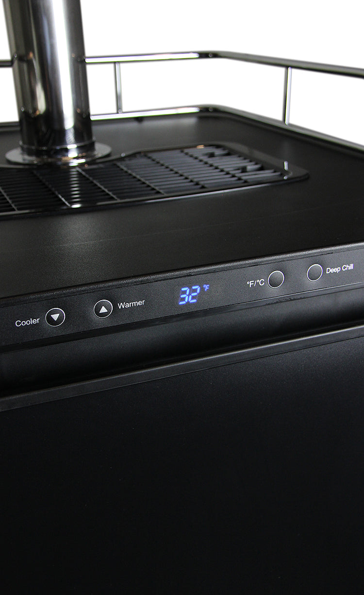With this keg beer refrigerator, you'll no longer have to guess what temperature a number on a dial will produce. It has a digital temperature display and push button controls that make it easy to set and verify the internal temperature - simple press the up or down button to adjust the temperature by one degree. It can be set up to display the temperature in either Fahrenheit or Celsius. Fan-forced cooling gives this kegerator one of the coldest temperature ranges of any beer cooler on the market today, and can be set as low as 32 degrees to dispense ice cold draft beer. The fan helps to provide even cooling throughout the cabinet. Easily accommodate any full size keg - including Miler and Coors kegs and rubber kegs - thanks to this keg refrigerator's spacious interior. It also holds up to two 5 gallon D system kegs or up to three 5 gallon Cornelius ball lock homebrew kegs, giving you the ability to dispense more than one beer keg at a time.