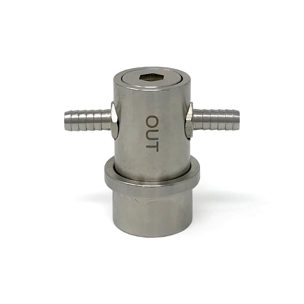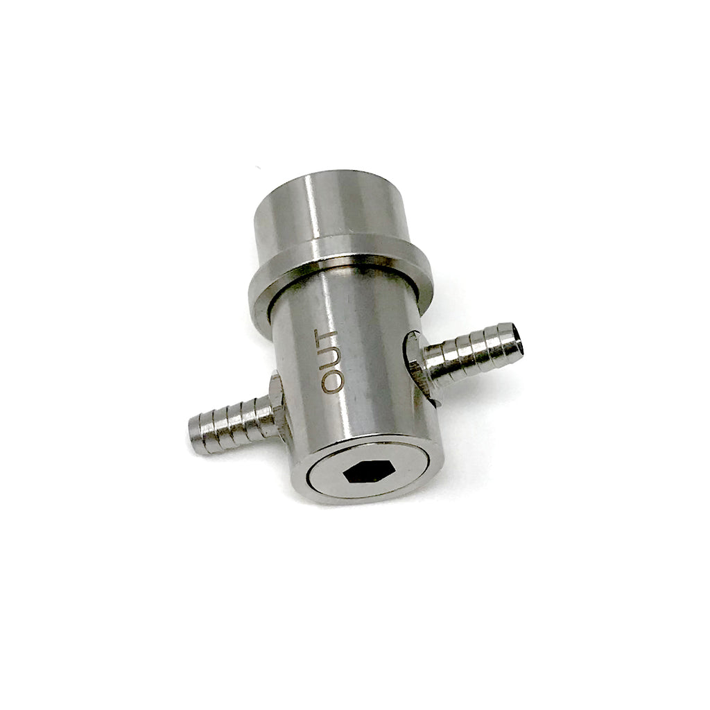 This machined stainless steel ball lock coupler was developed for a Daisy Chain Bag in Box dispense system. It features two opposing 1/4" barbs on one ball lock coupler.