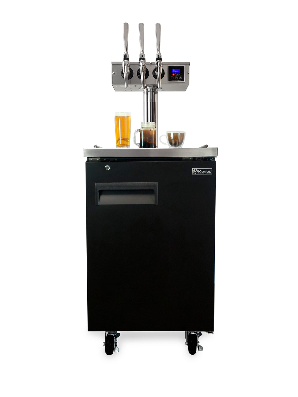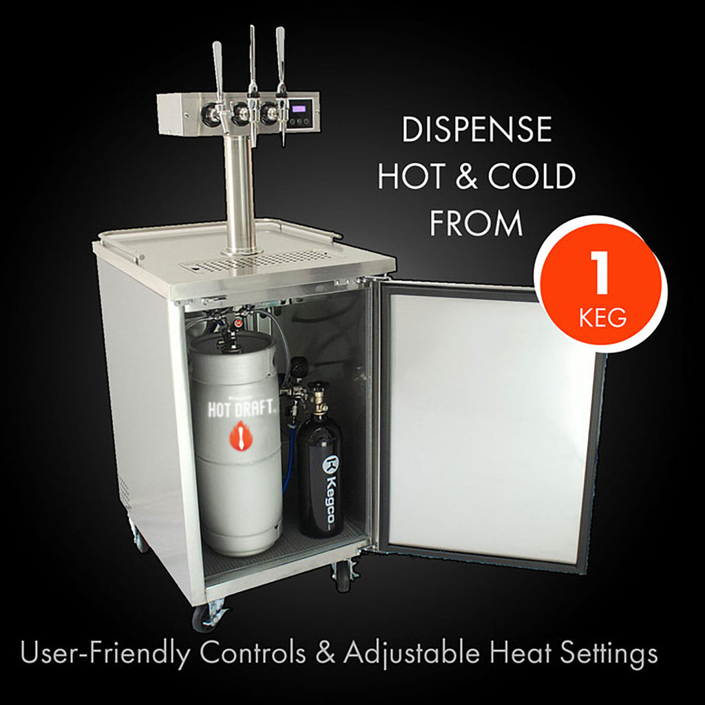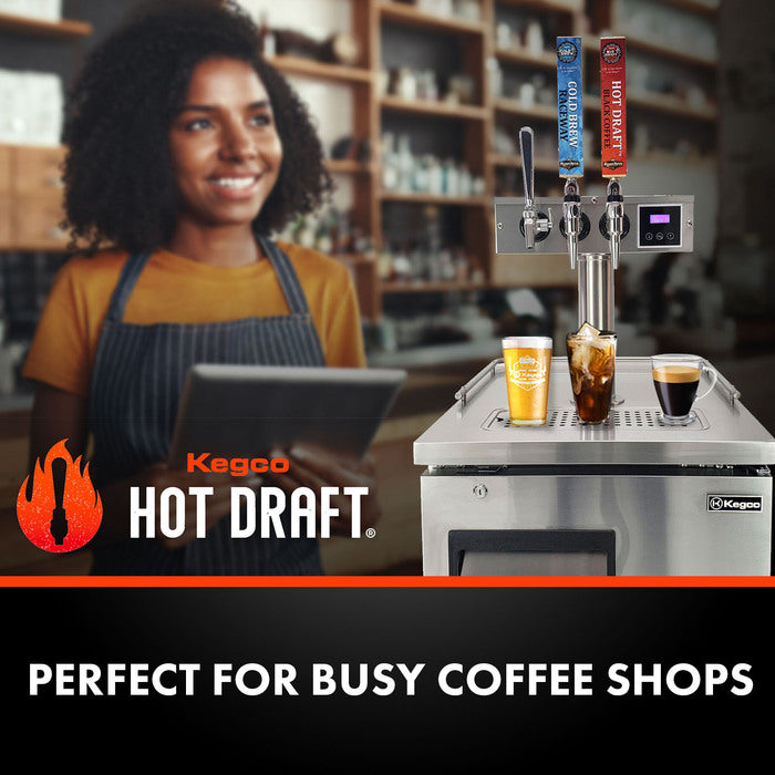 The Kegco Hot Draft ® system incorporates Kegco's reliable and powerful Commercial Kegerator systems to create the complete package for dispensing hot or cold cold brew coffee, and other beverages. Dispense from two kegs simultaneously - one keg for hot and cold nitro coffee and one keg for any kegged beverage, from beer and coffee to carbonated water and kombucha. This one unit provides multiple coffee options from one kegerator, saving space and money! Typically, providing many options can be costly but the nitro kegged coffee has a prolonged shelf life, minimizing wasted product. Additionally, this hot draft ® system will save you time brewing coffee. The Cup Counter feature keeps track of the cups of hot coffee that have been served.