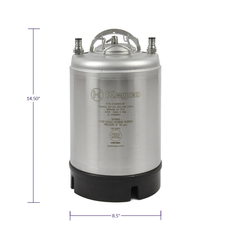 This Kegco AB2G-SH 2.5 gallon stainless steel ball lock keg (also called a Pepsi keg or a Cornelius keg) features a permanently molded rubber bottom skirt, durable stainless steel strap handle, and easy-to-access ball lock fittings that make cleanup hassle-free. The ball lock keg meets NSDA voluntary standards and is NSF (National Sanitation Foundation) approved. It is an excellent choice for storing and dispensing homebrew beer, wine, soda, kombucha, and even cold-brewed coffee. The stainless steel lid fastens tightly to the body and has a pull ring style pressure release valve that makes it easy to depressurize the keg. Working pressure must not exceed 130 P.S.I.G.