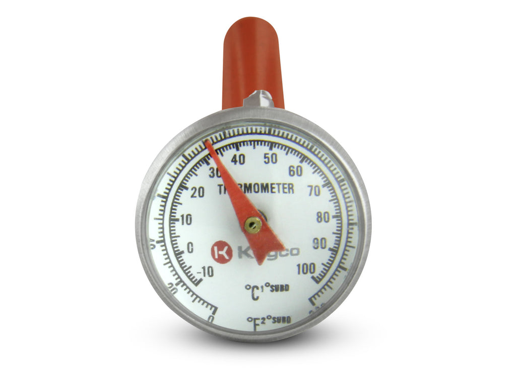 This convenient Kegco Pocket Dial Thermometer allows you to easily monitor the temperature of your boil. It has a 1" face marked in Fahrenheit and Celsius and a 0-220 degree Fahrenheit (-10-100 degree Celsius) temperature range. The 5" probe and water-tight lens help prevent damage during use. Thanks to the pocket clip, it is easy to keep it with you.