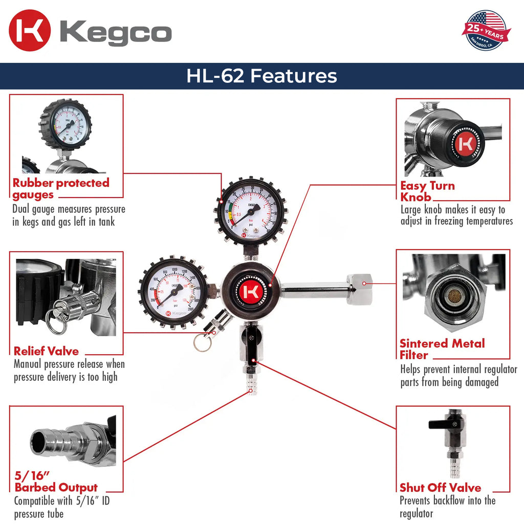 Kegco is proud to present the new HL-62 Premium Double Gauge CO2 Regulator, which has been specially designed to provide maximum convenience and durability in busy commercial environments like bars, tasting rooms, and restaurants. This brewery-grade regulator features a multi-stage body for more precise control when making small adjustments to the output pressure. The first stage reduces the output pressure from the tank to a more manageable pressure, and the second stage fine tunes that pressure for output to the keg, allowing adjustments to be optimized for the operational range of beer, wine, coffee or whatever you're dispensing. A large adjustment knob allows you to make quick and accurate adjustments by hand and turns effortlessly, even in freezing temperatures.