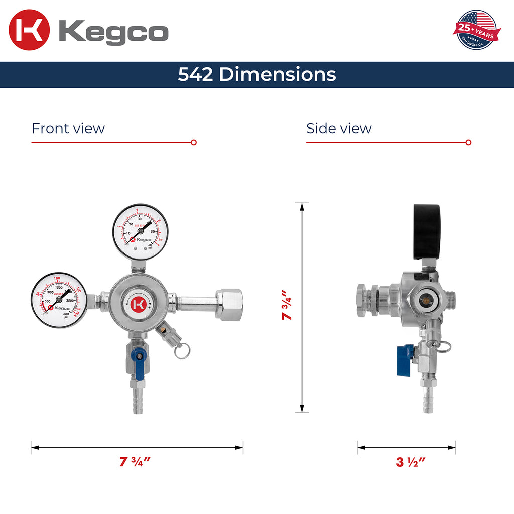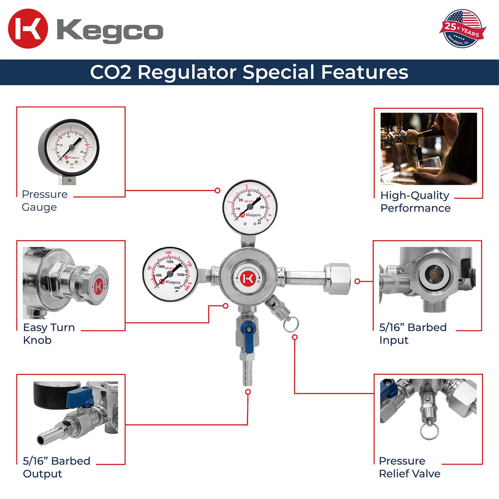 This Pro Series regulator comes with two gauges that both have an easy to read design. The top gauge displays 0-60 PSI and allows you to see how much CO2 pressure is in the keg. The second gauge on the side of the regulator displays 0-2000 PSI and allows you to see how much gas is left in the CO2 tank. This commercial grade regulator comes equipped with a large adjustment knob with a lock ring that allows gas flow to changed without the need for a screwdriver. The regulator includes a tamper proof safety pressure relive valve that releases at 45 psi and a shut off valve that allows for instantly shutting off pressure to the keg without backing up your gas line.