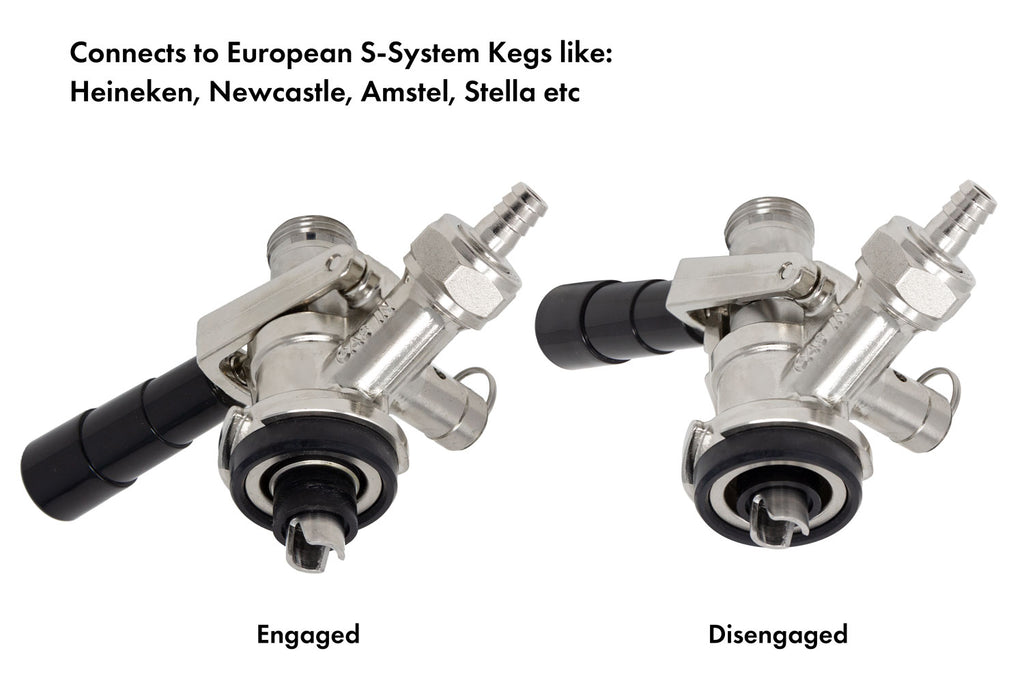 - This S system coupler is easy to use - simply pull out and down on the lever handle to tap a keg