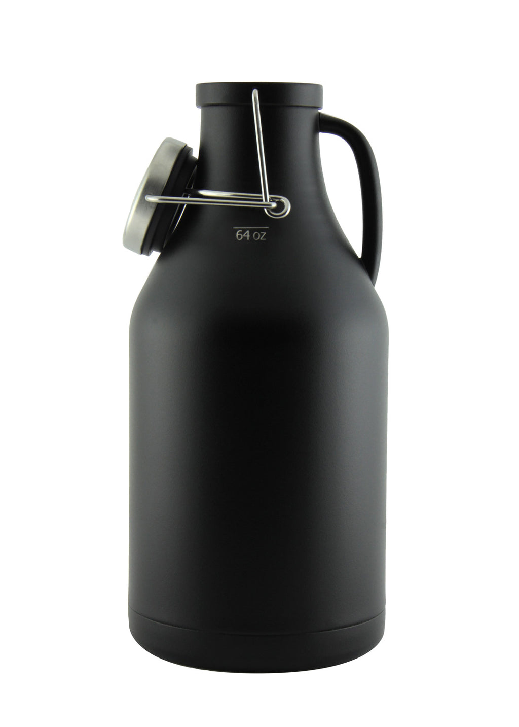 - The 64 oz growler is construced of 304 grade stainless steel with a sleek black finish, a sturdy metal handle, and a flip-top lid that is securely attached to the growler