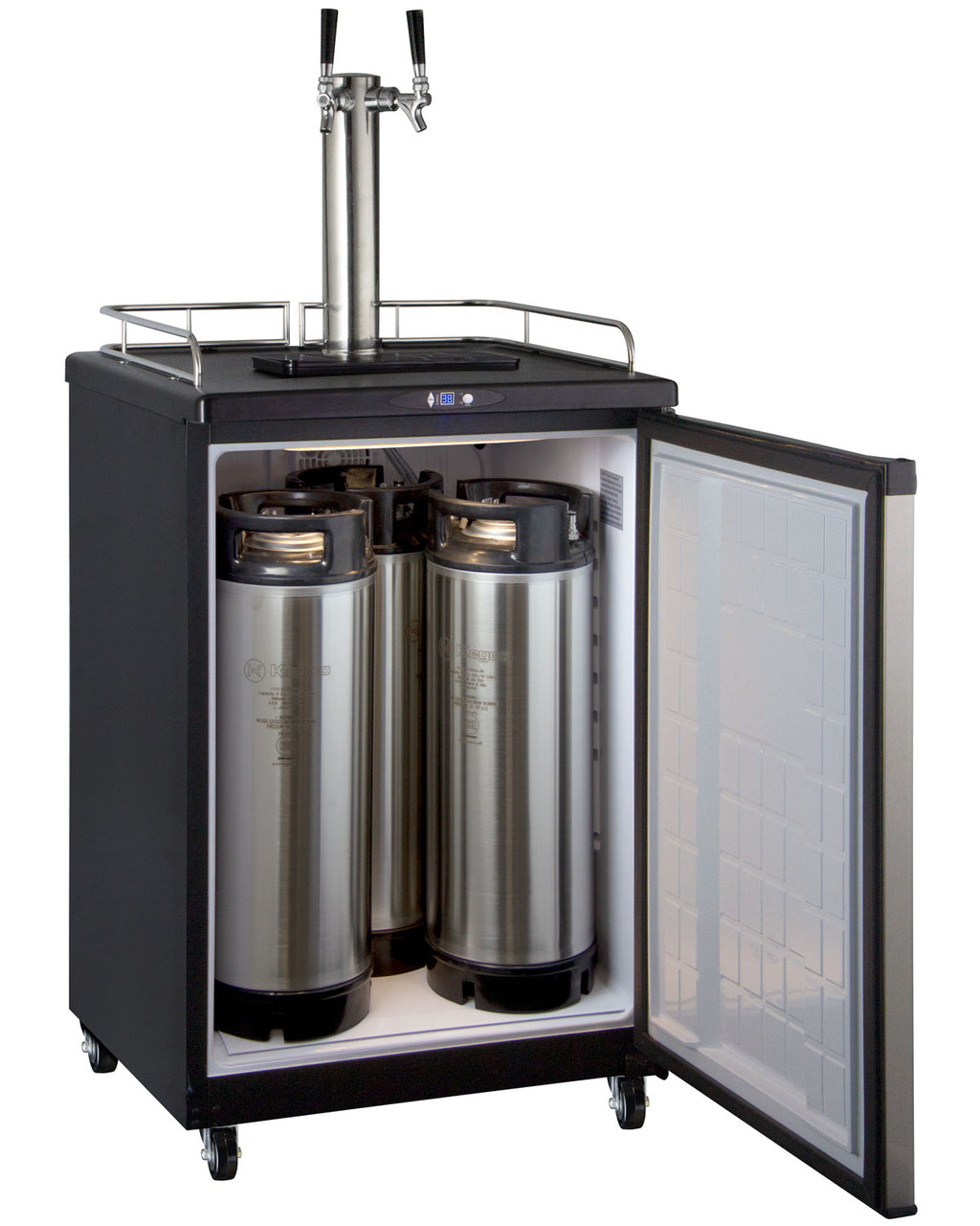 The spacious 5.8 cu.ft. interior can accommodate one full size, pony, or quarter slim keg, two 5 gallon commercial kegs, three ball lock kegs, or two pin lock kegs.